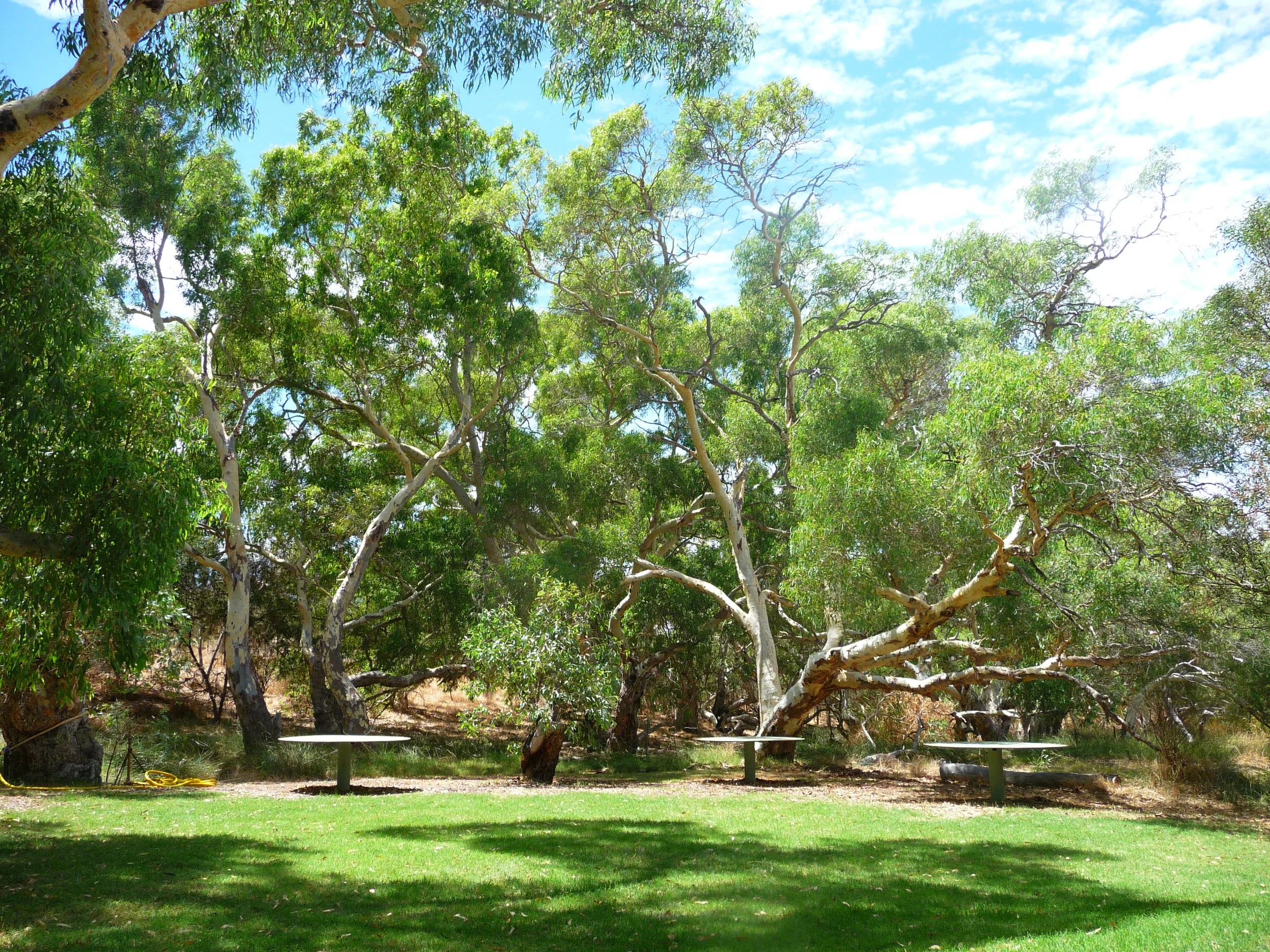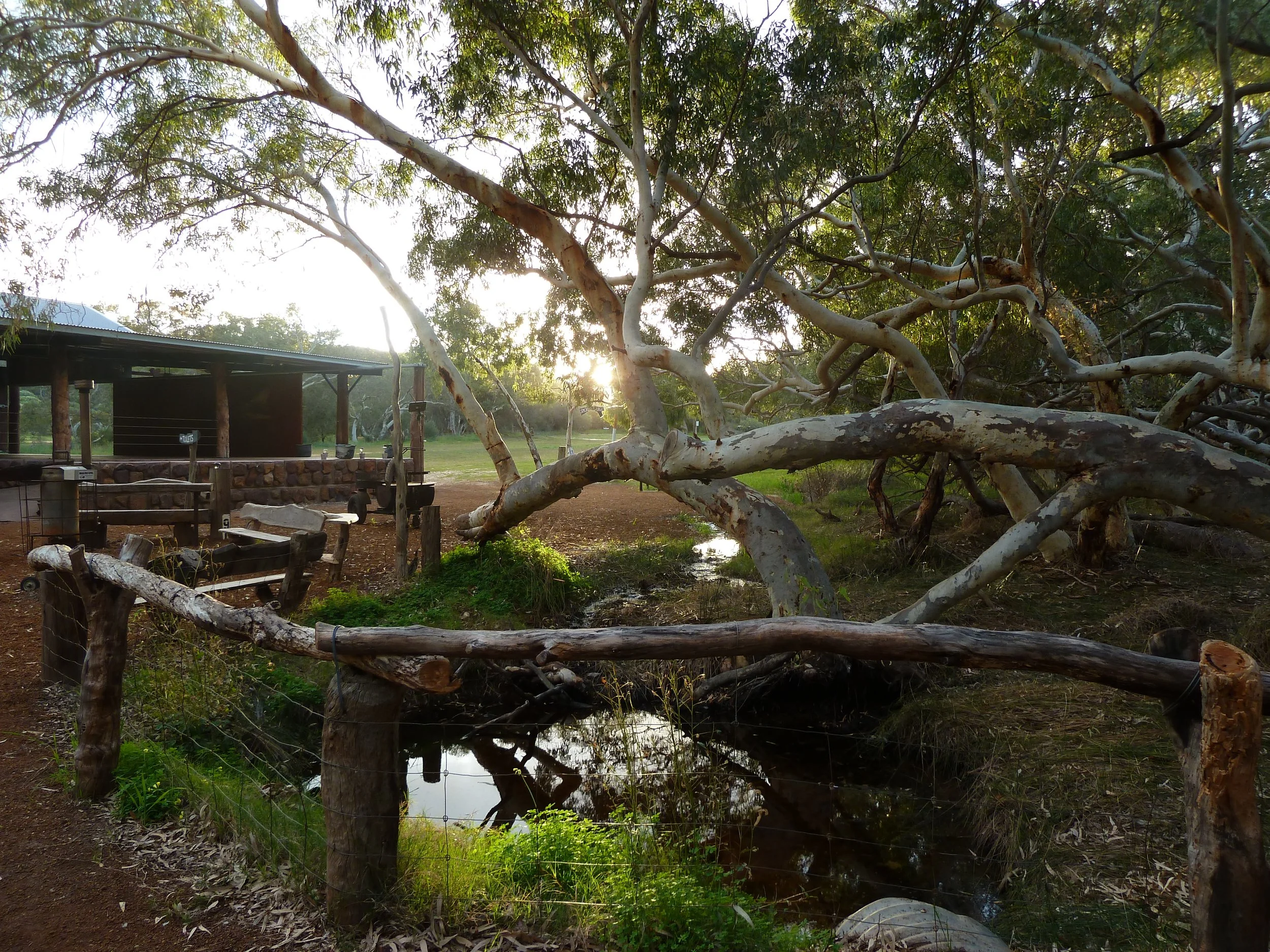 An intimate, shaded space tucked beneath towering gums beside a flowing winter creek.
